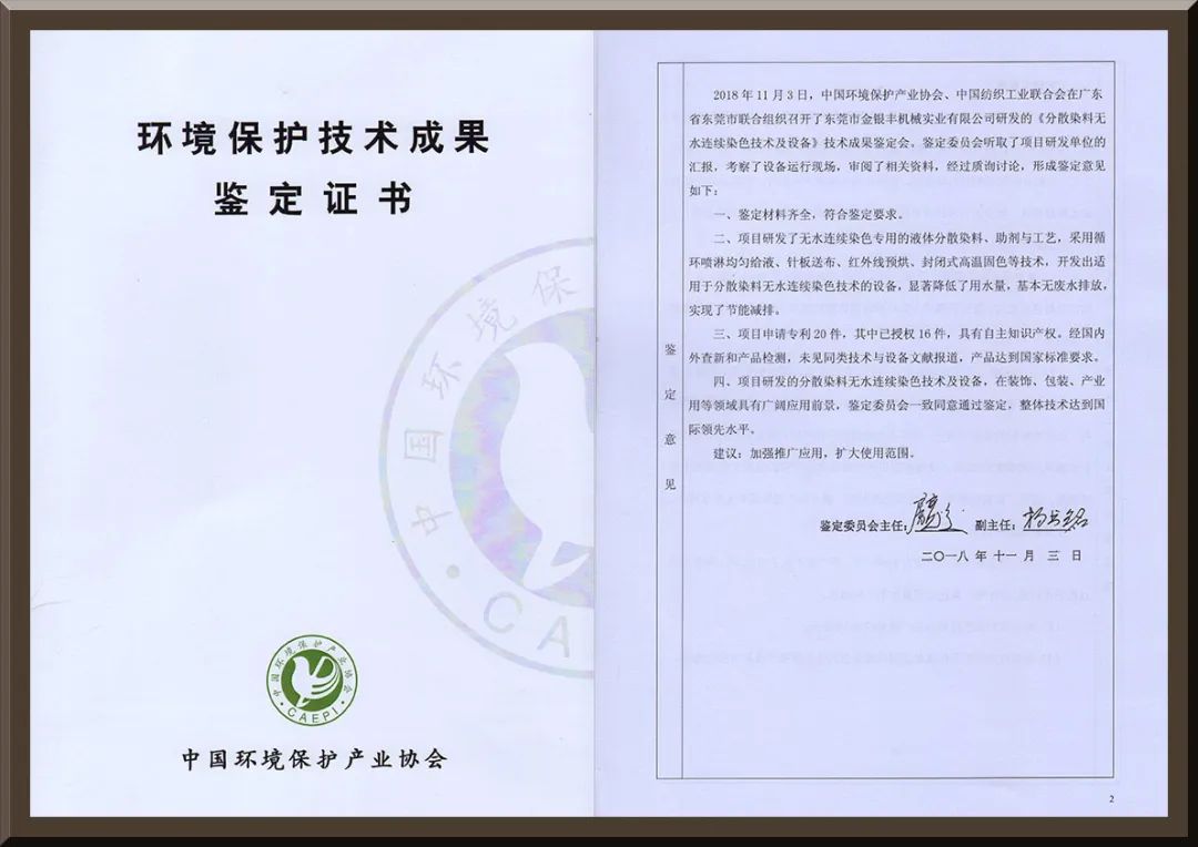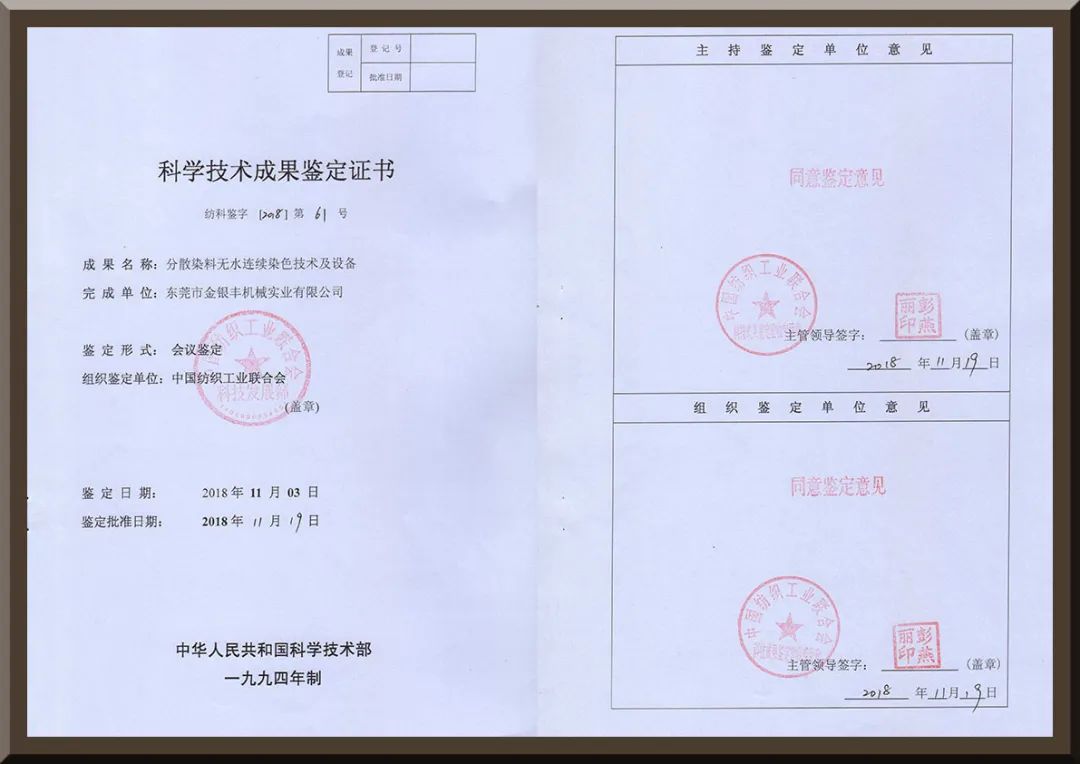 2018年10月,金银丰研发的“分散染料无水连续染色技术”通过技术成果鉴定,鉴定结论为“国际领先”。