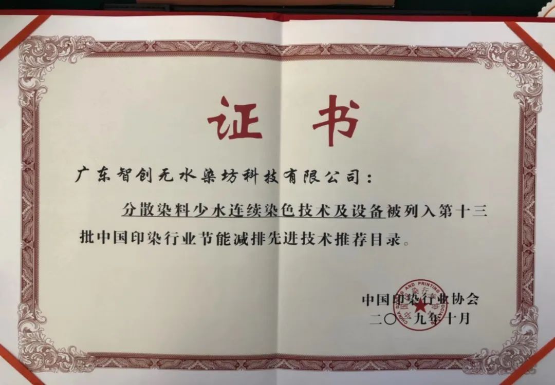 2019年11月,“分散染料无水连续染色技术”入选水利部、工信部、中国印染行业协会国家鼓励的工业节水技术目录。