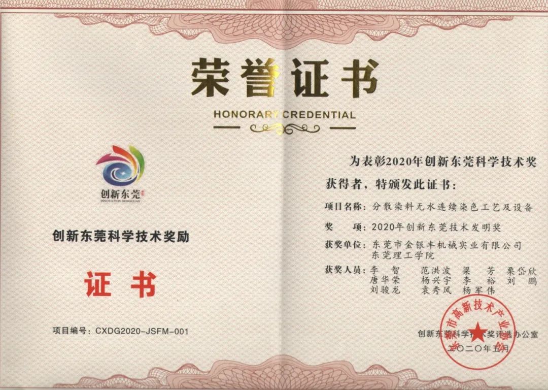 东莞市金银丰机械实业有限公司研发的“分散染料无水连续染色技术及设备”自面市以来收到了社会各界的关注及认可,屡获殊荣。