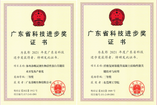▲广东菲鹏生物有限公司、东莞理工学院,省科技奖获奖证书