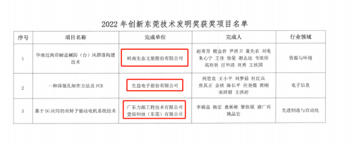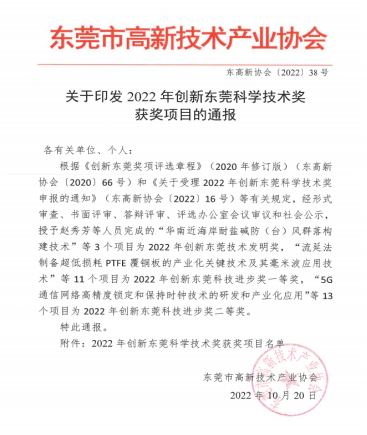2022年,受理创新东莞科学技术奖申报65项,经评审出技术发明奖3项、科技进步一等奖11项、二等奖13项,其中10项获奖项目经推荐提名2022年度省科学技术奖。