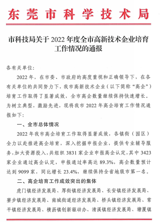2022年,经省科学技术厅组织专家评审今年申报的高企,我市申报3831家、通过评审共3423家企业通过高企认定,申报通过率高达89.4%,高企数量达9099家,同比增长23.4%,超额完成市委市政府下达的年度工作任务,高企总量继续保持全省地级市第一名。在市科学技术局指导下,主要采取如下措施: