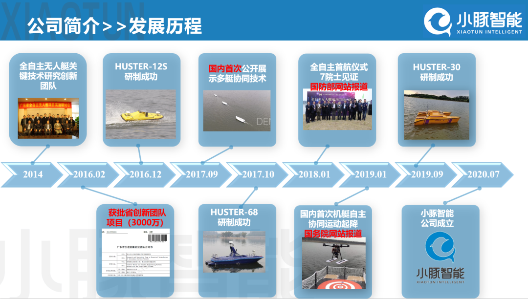 公司创建于2020年7月,前身为“广东省创新团队”,团队核心成员包括一批IEEE Fellow、教授和青年博士,在无人船环境感知、路径规划与自主控制、多艇协同等方面突破了一批共性技术和核心功能部件,拥有各类知识产权40余件,其中发明30余件。公司成立第二年即获认定为国家高新技术企业,并获资本市场高度认可,目前已获两轮融资。