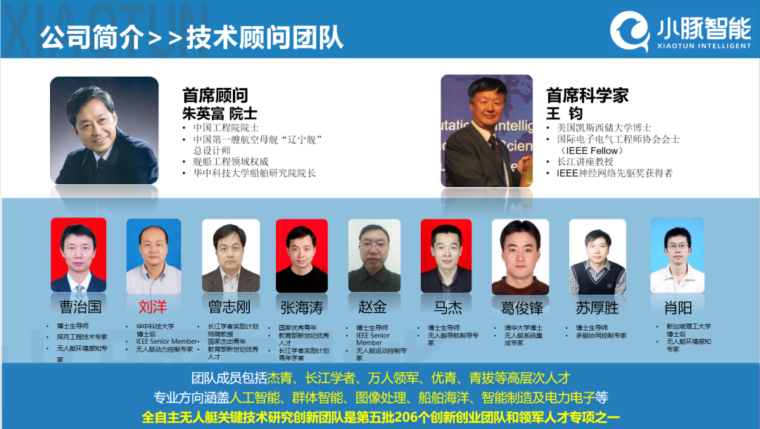 公司技术团队是由广东华中科技大学工业技术研究院于2016年引进的广东省第五批创新科研团队——全自主无人艇关键技术研究创新团队,主要开展全自主无人艇关键技术研究。团队以IEEE Fellow、长江学者、香港城市大学王钧教授为带头人,辽宁舰总设计师朱英富院士担任团队顾问。