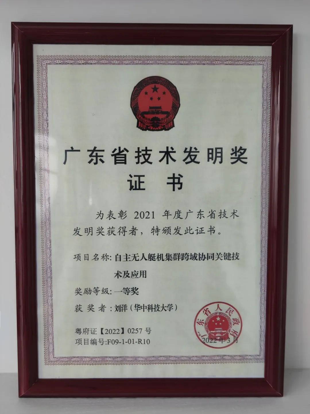 ▲2021年度广东省技术发明奖证书