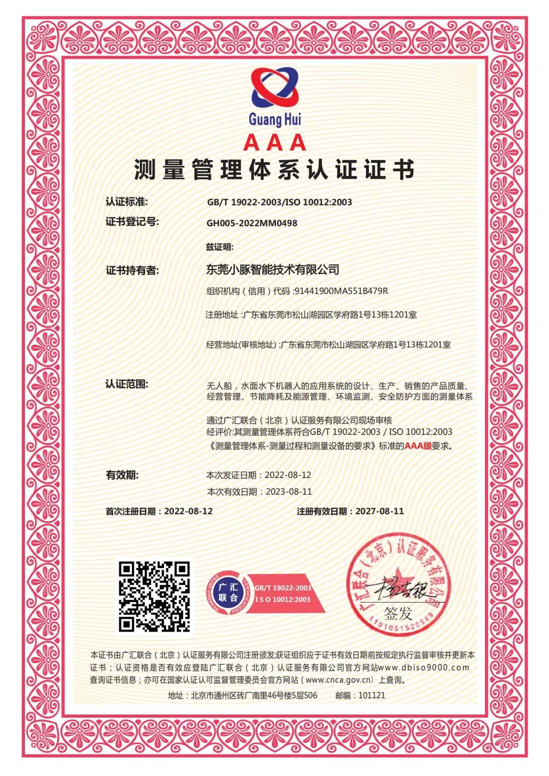 ▲3A级测量管理体系认证证书