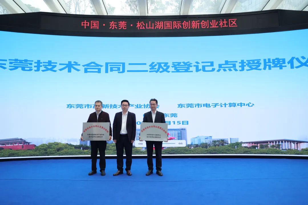 随后,吴文剑副局长分别为东莞市电子计算中心主任卿剑、东莞市高新技术产业协会秘书长刁思勉授予了二级技术合同登记点牌匾,技术合同登记点的顺利落成,是东莞瞄准制造业高端化、智能化、绿色化的方向,加快形成新质生产力,引领产业升级的里程碑象征。