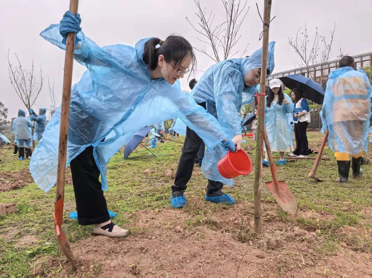 活动现场暖意融融,细雨为这场特殊的“爱情之约”增添了几分浪漫诗意。50对新婚夫妇携手赴约,在工作人员引导下,冒着微凉细雨两两结伴投入植树,挥锹铲土、扶正树苗、培实新土、浇灌春水,雨水打湿了他们的衣角,却挡不住脸上的甜蜜笑意,默契配合间,既定格了新婚甜蜜,更寄托了对婚姻长久、并肩成长的美好期许。每棵“爱情树”上系着的新人专属认养牌,在细雨中愈发醒目,如同时光胶囊封存甜蜜约定,成为爱情与生态共生的独特见证,也让这片植树林地成为园区婚俗文化与生态建设的特色阵地。