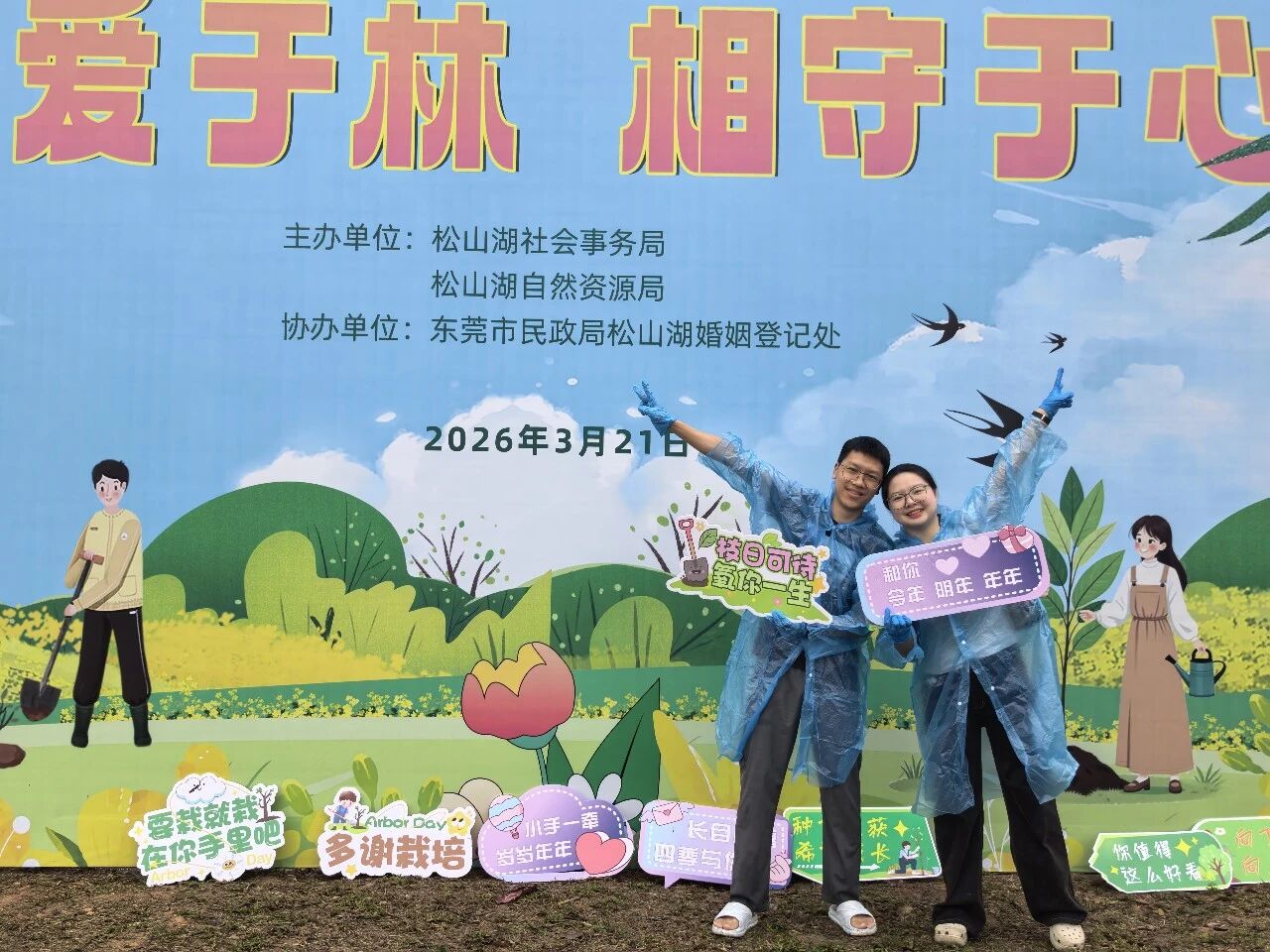 3月21日上午,细雨霏霏、润物无声,松山湖社会事务局与松山湖自然资源局联合主办的“植爱于林 相守于心”婚俗新风植树活动在科学公园顺利开展。本次活动以树为媒、以爱为桥,即便细雨微凉,也未阻挡新婚夫妇的热情,既传递了简约文明的绿色婚俗新风,助力婚俗改革走深走实,也为绿美松湖建设增添爱情新绿,实现生态保护与婚俗文明双向赋能。