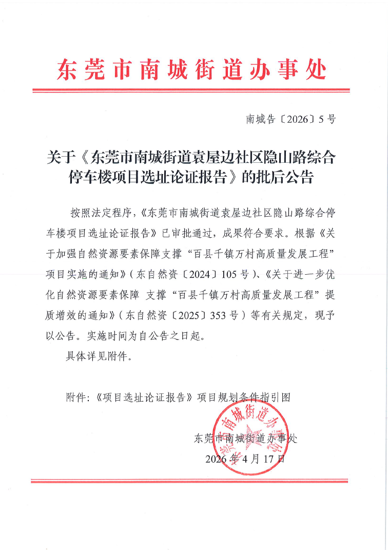 关于《东莞市南城街道袁屋边社区隐山路综合停车楼选址论证报告》的批后公告